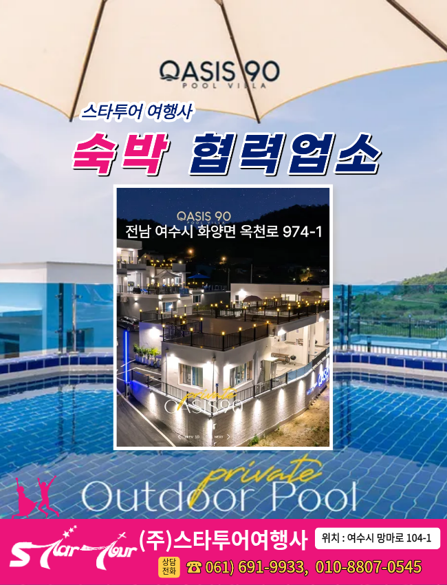 오늘은 정말 기쁜 소식을 들고 찾아왔어요. 저희 스타투어가 여수 화양면에 위치한 아름다운 숙소, 오아시스90과 특별한 협력 계약을 맺었답니다!