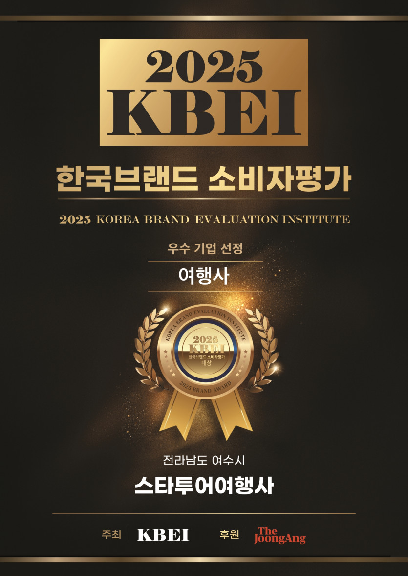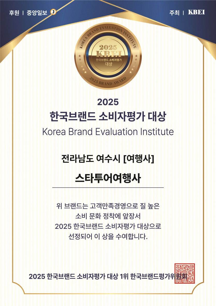중앙일보에서 후원하고 KBEI(Korea Brand Evaluation Institute)에서 주최하는 권위 있는 시상식, '2025 한국 브랜드 소비자평가 대상'에서 저희 스타투어여행사가 압도적인 평가로 영예의 1위를 수상했습니다!